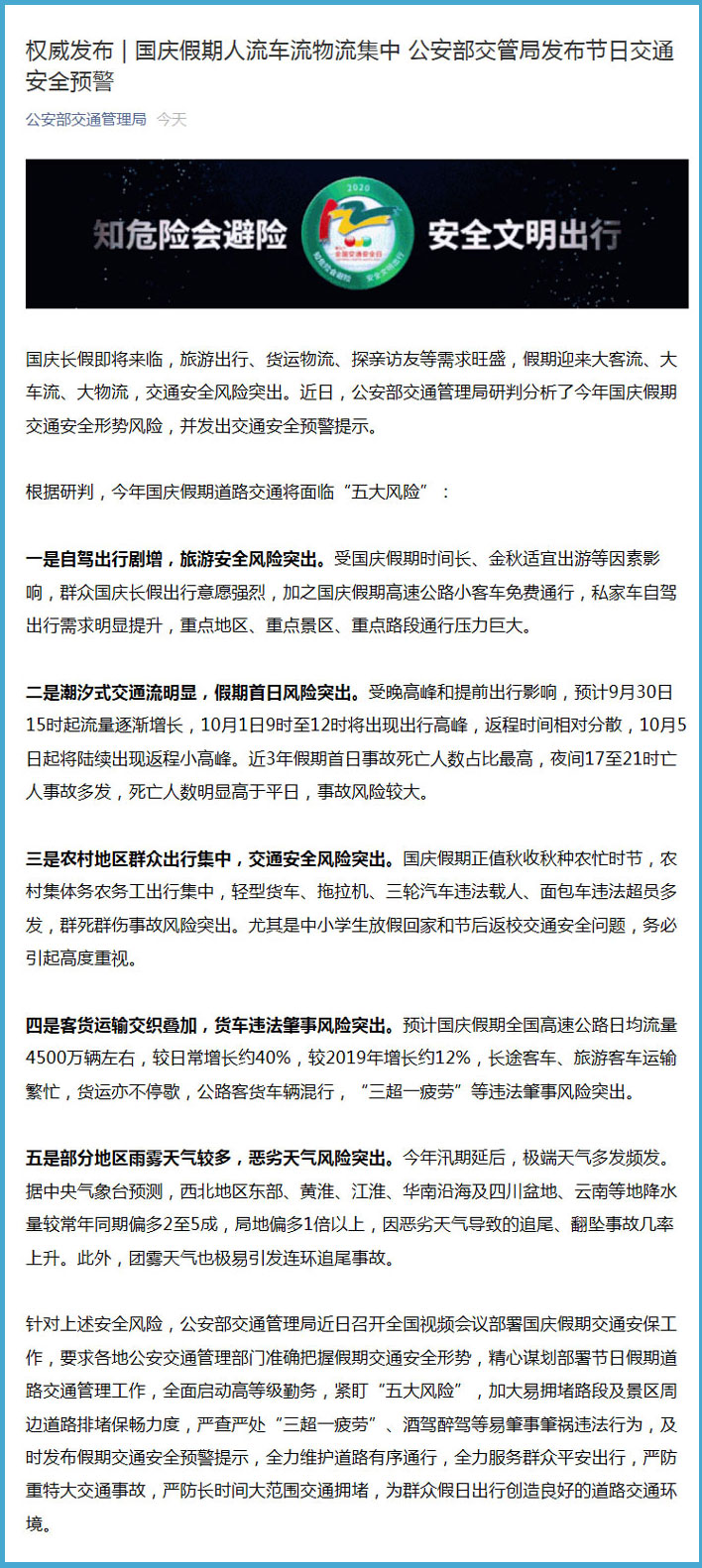 国庆长假即将来临,旅游出行、货运物流、探亲访友等需求旺盛,假期迎来大客流、大车流、大物流,交通安全风险突出。近日,公安部交通管理局研判分析了今年国庆假期交通安全形势风险,并发出交通安全预警提示。