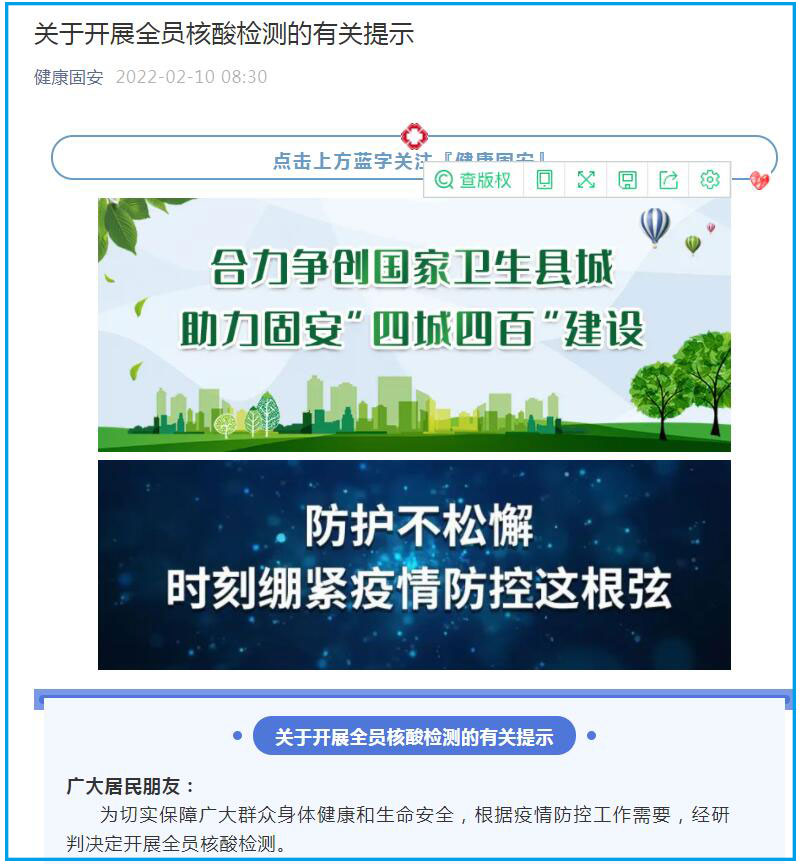 据健康固安微信公众号消息,2月10日,河北廊坊市固安县新型冠状病毒感染的肺炎疫情防控工作领导小组办公室发布关于开展全员核酸检测的有关