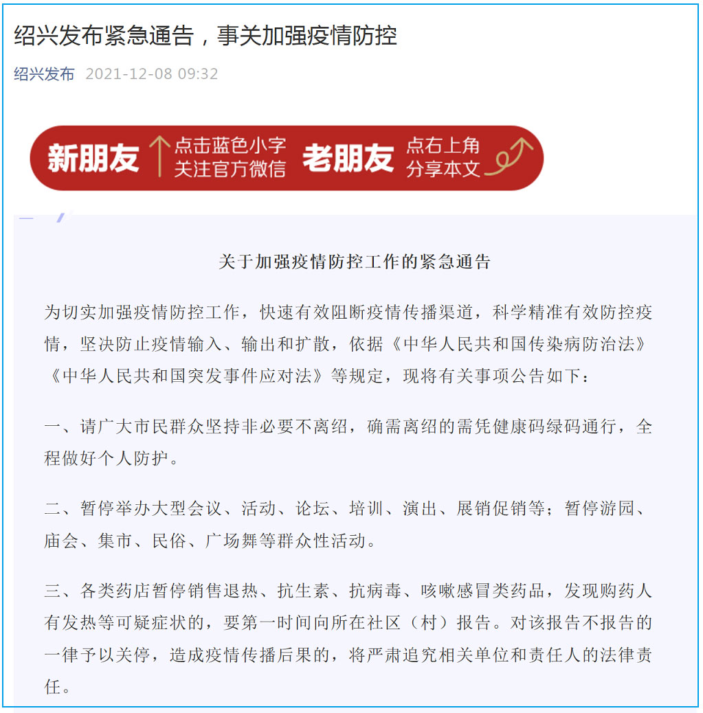 据绍兴发布微信公众号消息,12月8日,绍兴市发布关于加强疫情防控工作的紧急通告。通告称,为切实加强疫情防控工作,快速有效阻断疫情传播